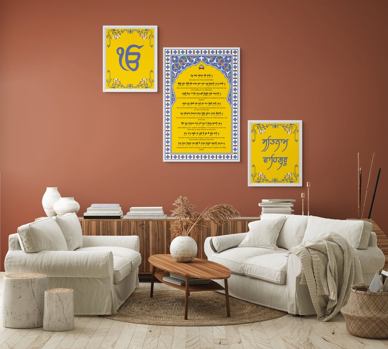 Enhance your spiritual journey with this elegant set of three white wooden and metal-framed Gurbani artworks, thoughtfully designed to inspire faith, tranquility, and divine connection. This sacred combo features: